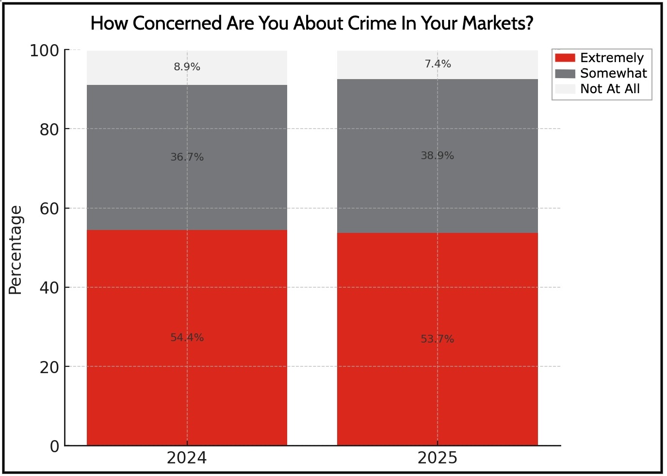 While operators’ concerns about crime remained largely unchanged between 2024 and 2025, with those who described themselves as “extremely concerned” holding steady at roughly 54%, there may be a heightened sense of awareness in the other categories. The portion of respondents saying crime was “not a concern” slipped from 8.9% to 7.4%, while those calling it “somewhat of a concern” increased from 36.7% to 38.9%.