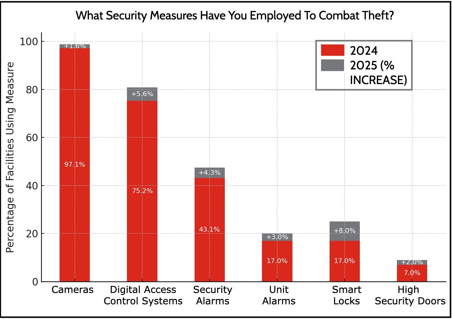 Nearly all facilities in the survey (~99%) now use surveillance cameras, up slightly from 97% in 2024, reinforcing that visual deterrence remains the most popular form of security. Other significant gains were in digital access control systems (+5.6%), security alarms (+4.3%), and the largest increase, smart locks (+8%), showing operators are open to more tech-driven solutions. Even modest increases in unit alarms (+3%) and high-security doors (+2%) show that operators are getting serious about security. And, with no respondents now dismissing crime as a reputation issue, they appear to be taking a more proactive stance.