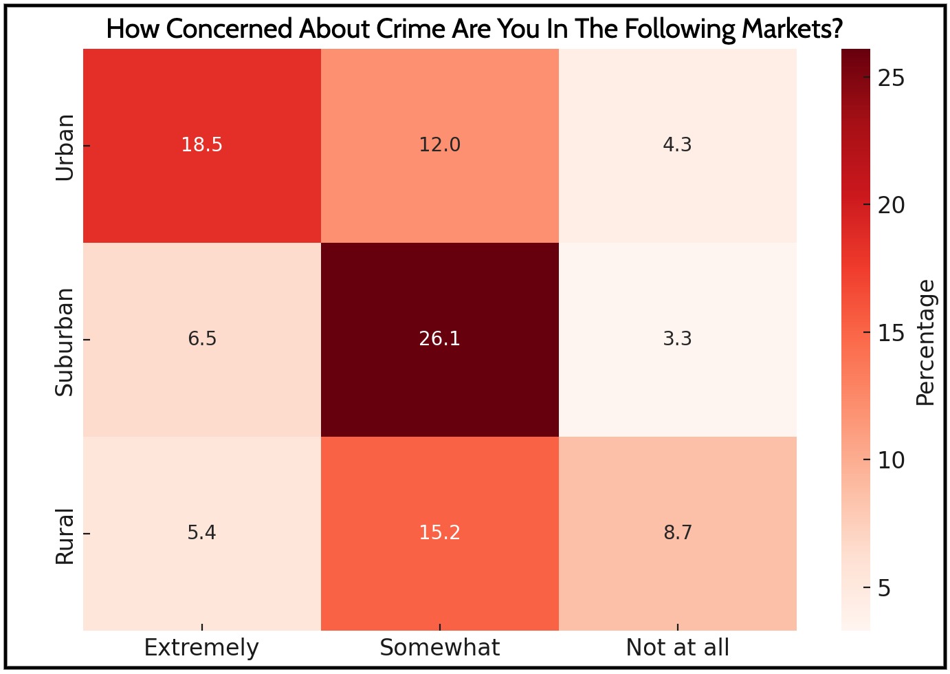 Concern levels differ sharply by market type. Urban operators remain the most worried: nearly 19% described themselves as extremely concerned and another 12% fell into the somewhat concerned category. That means roughly one in three urban respondents view crime as a persistent issue in their markets.