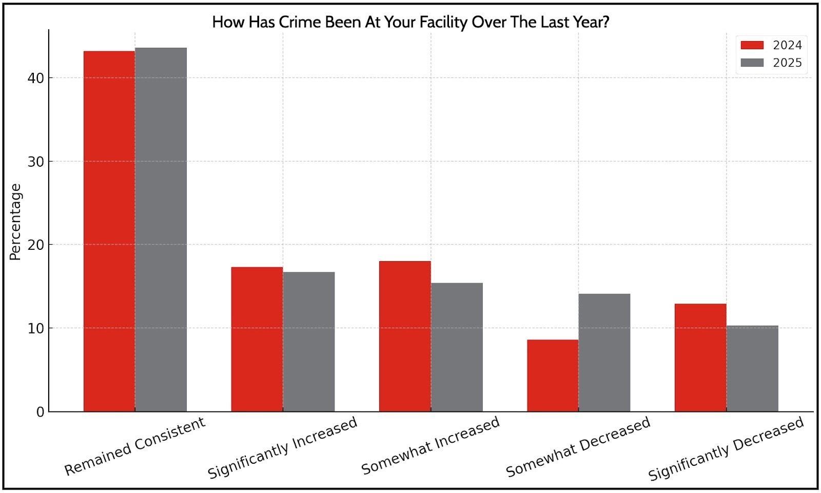 The majority of operators—roughly 43% in both 2024 and 2025—said crime at their facilities has remained consistent. While that could indicate stability, it also leaves room for interpretation, as “consistent” may reflect anything from persistently low crime to persistently recurring crime.